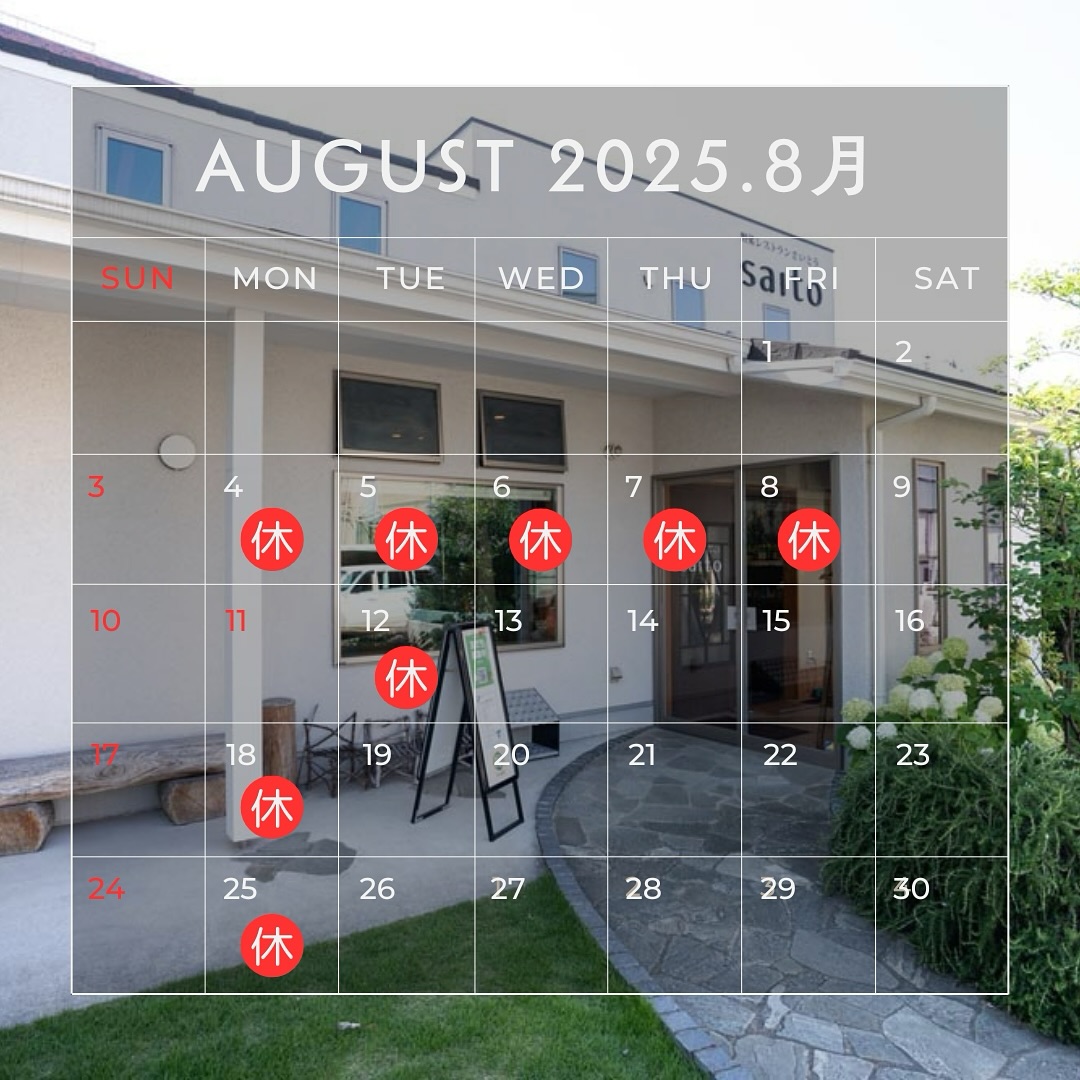 【8月の休業日について】【8月の休業日について】 8月は休業日が変則的ですのでご注意ください。 また、近日中に7月のメニューを告知いたしますので、 そちらもぜひお楽しみにお待ちくださいませ。 暑い日が続いていますが、 皆さま体調にはお気をつけて […]