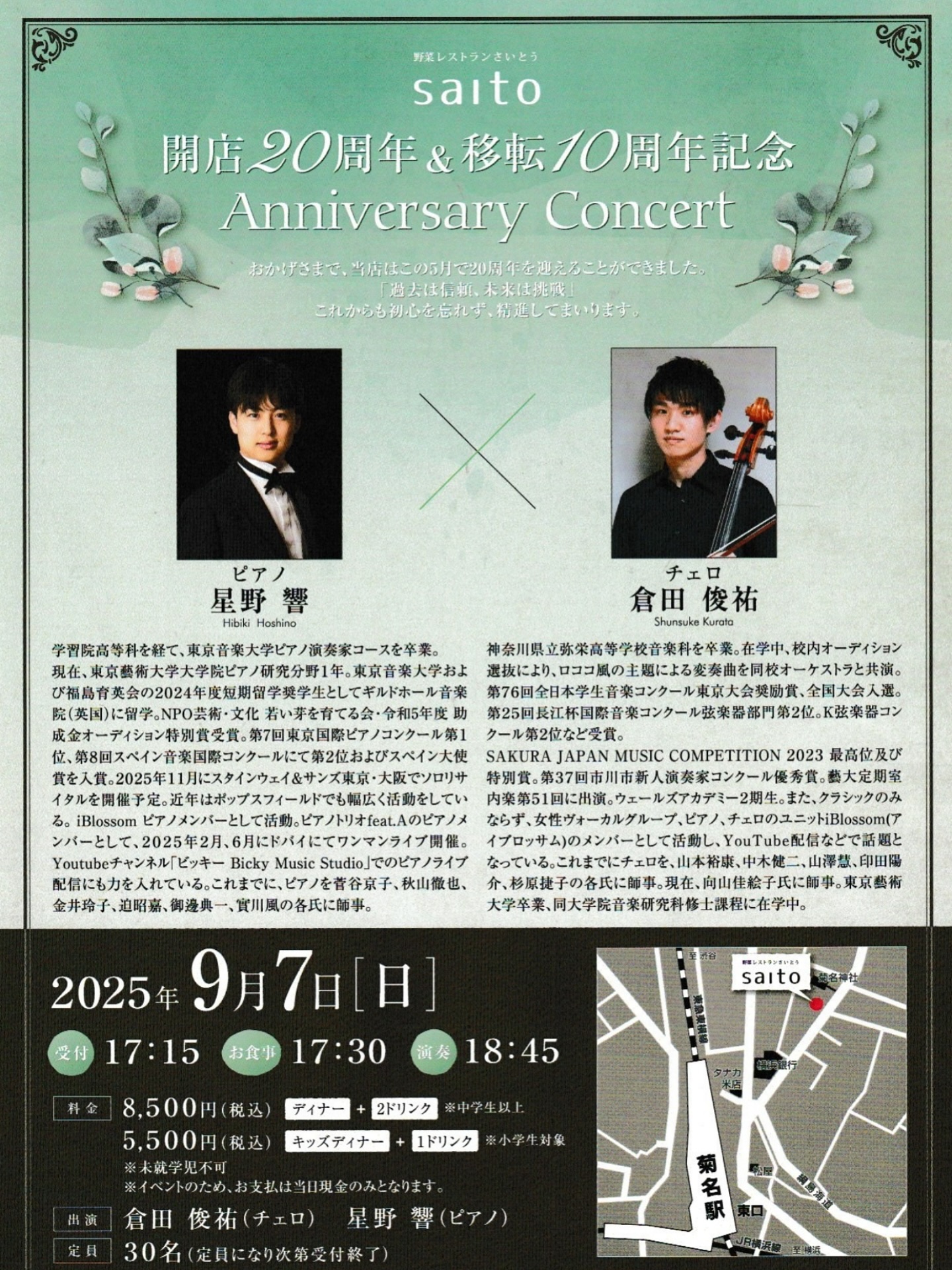 【20周年Aniversary Concert】【20周年Aniversary Concert】 ■開店20周年&移転10周年記念 Aniversary Concert 演奏者:星野響(ピアノ)×倉田俊佑(チェロ) 2025年5月に、おかげさまで 開店20周年を迎える […]