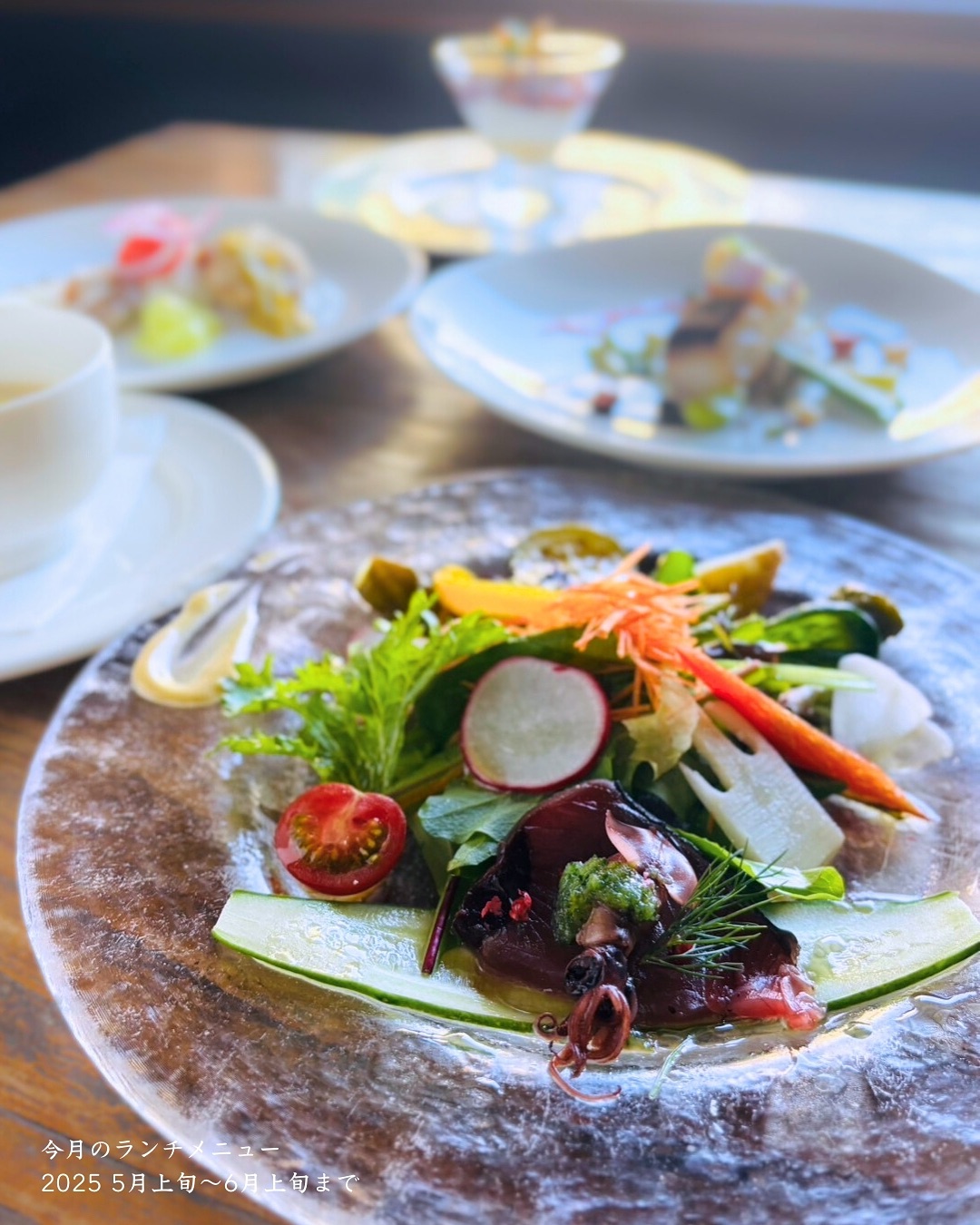 今が旬の地場野菜と果物を、和洋織り交ぜた様々なソースでお楽しみいただけます。今月のランチメニューもぜひお楽しみくださいませ!